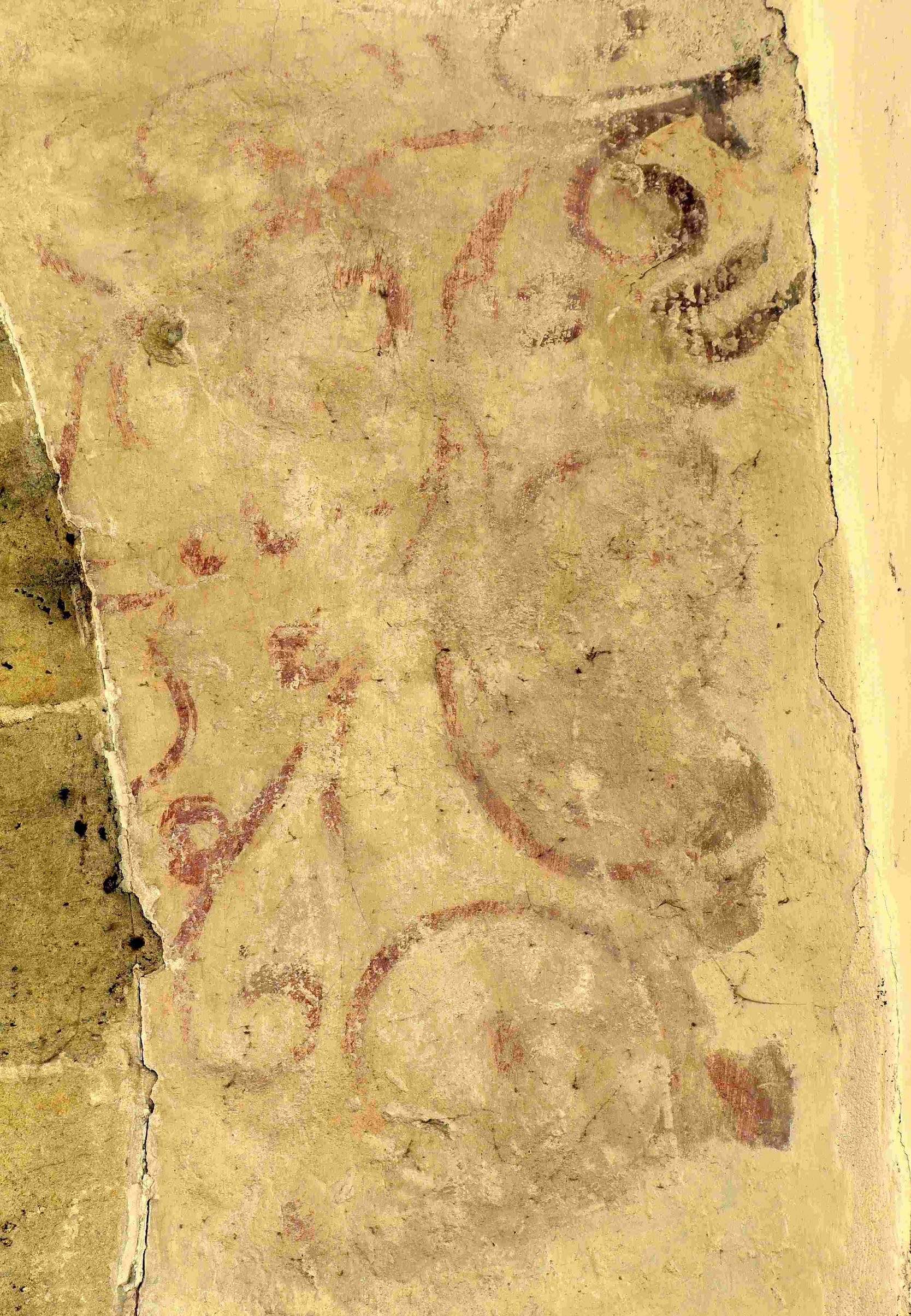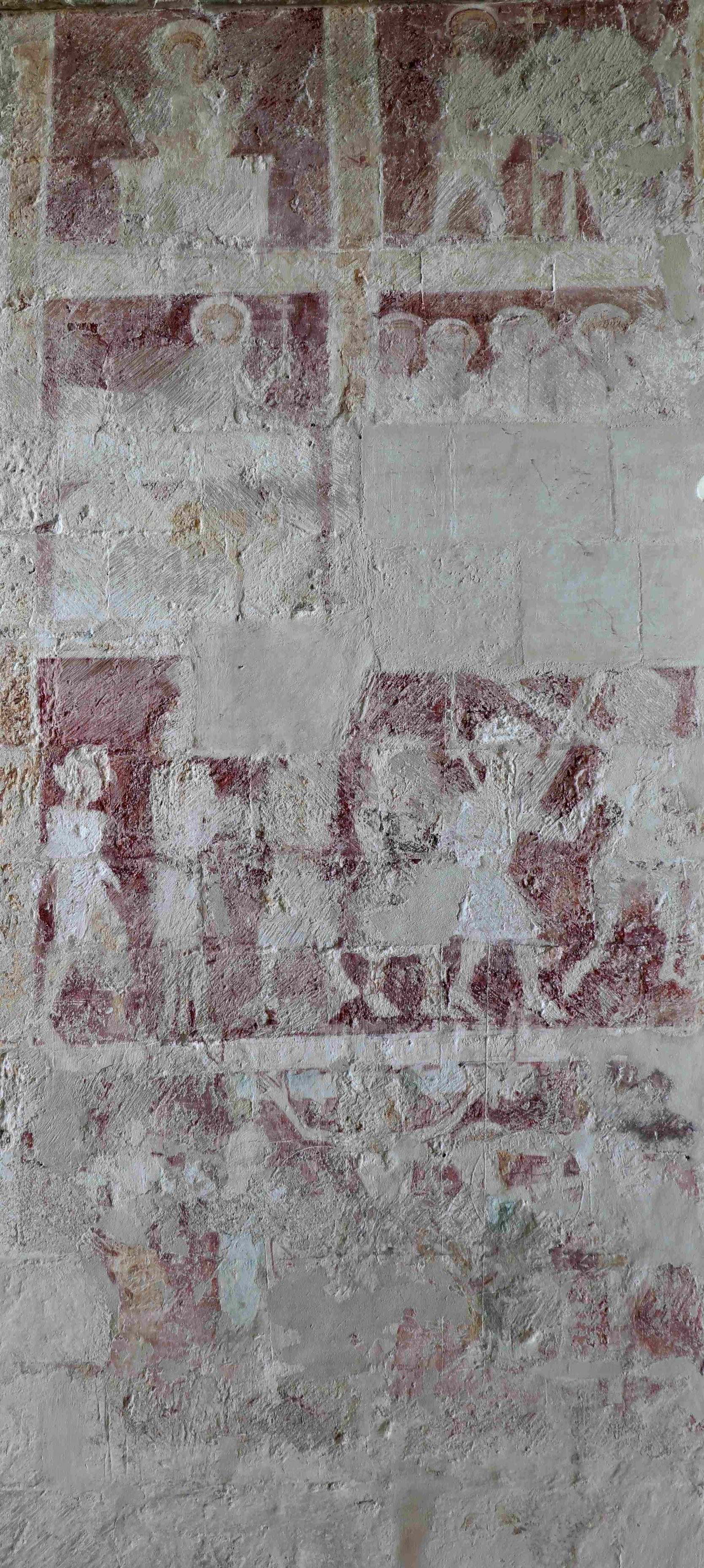 The largest area of wall painting is seen to the right of the chancel arch, dating from around 1300 or perhaps slightly later.