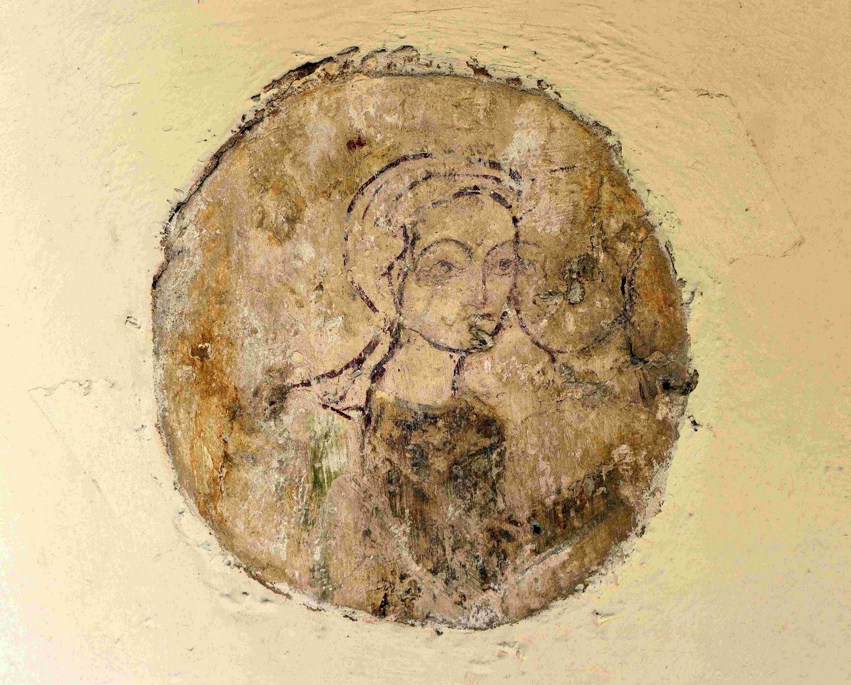 High up on the south wall of the aisle there’s a small circular mid-13th century painting, called “The Salutation”, which represents the meeting of Mary and Elizabeth (Luke 1:39-45).