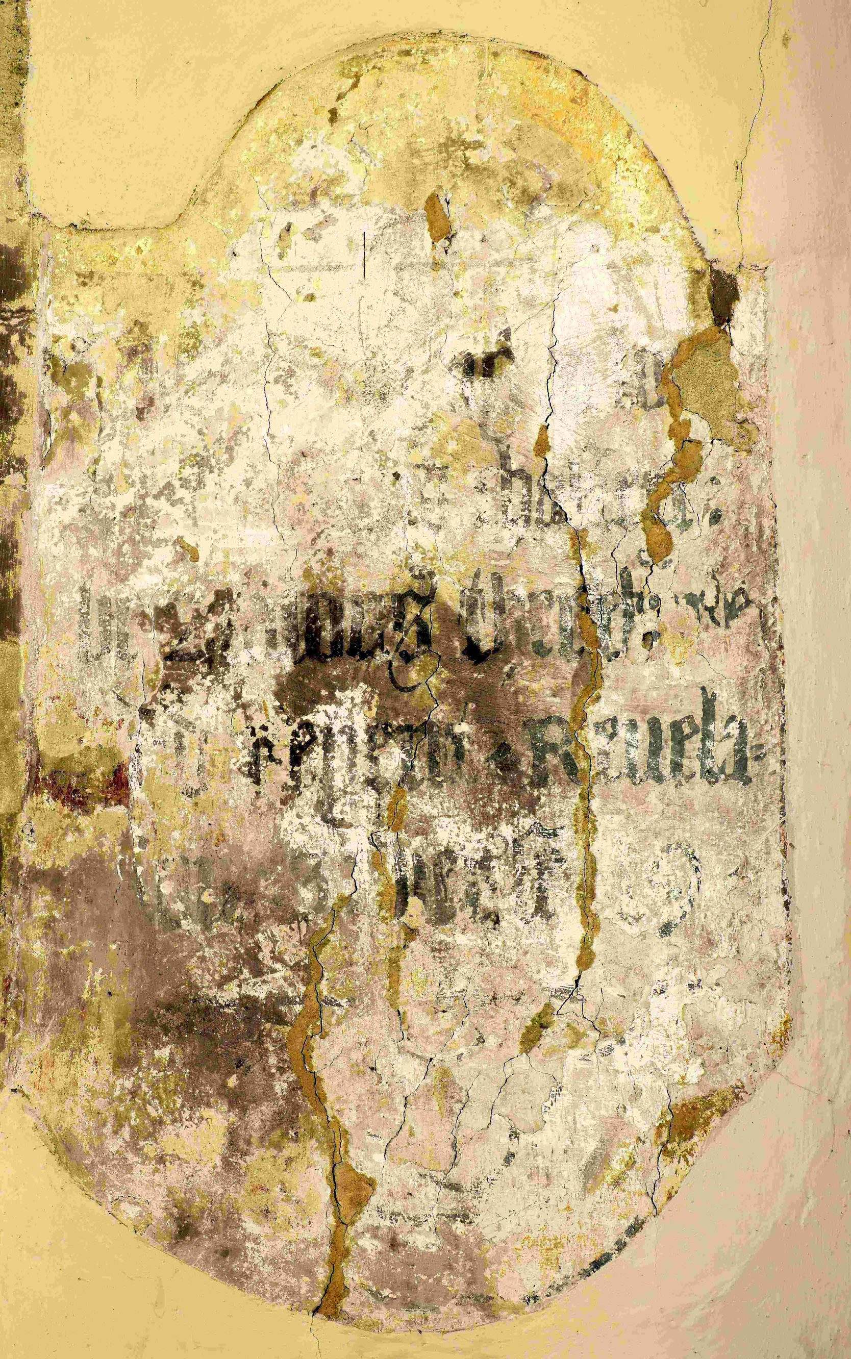 The black letter text on the wall to the right of the east window in the south aisle is later than the figurative wall paintings at the side of the chancel arch. This text obscures an earlier wall painting showing a Nativity scene – the infant Christ on the lap of the Virgin Mary with a kneeling ecclesiastic, probably the donor of the wall painting.