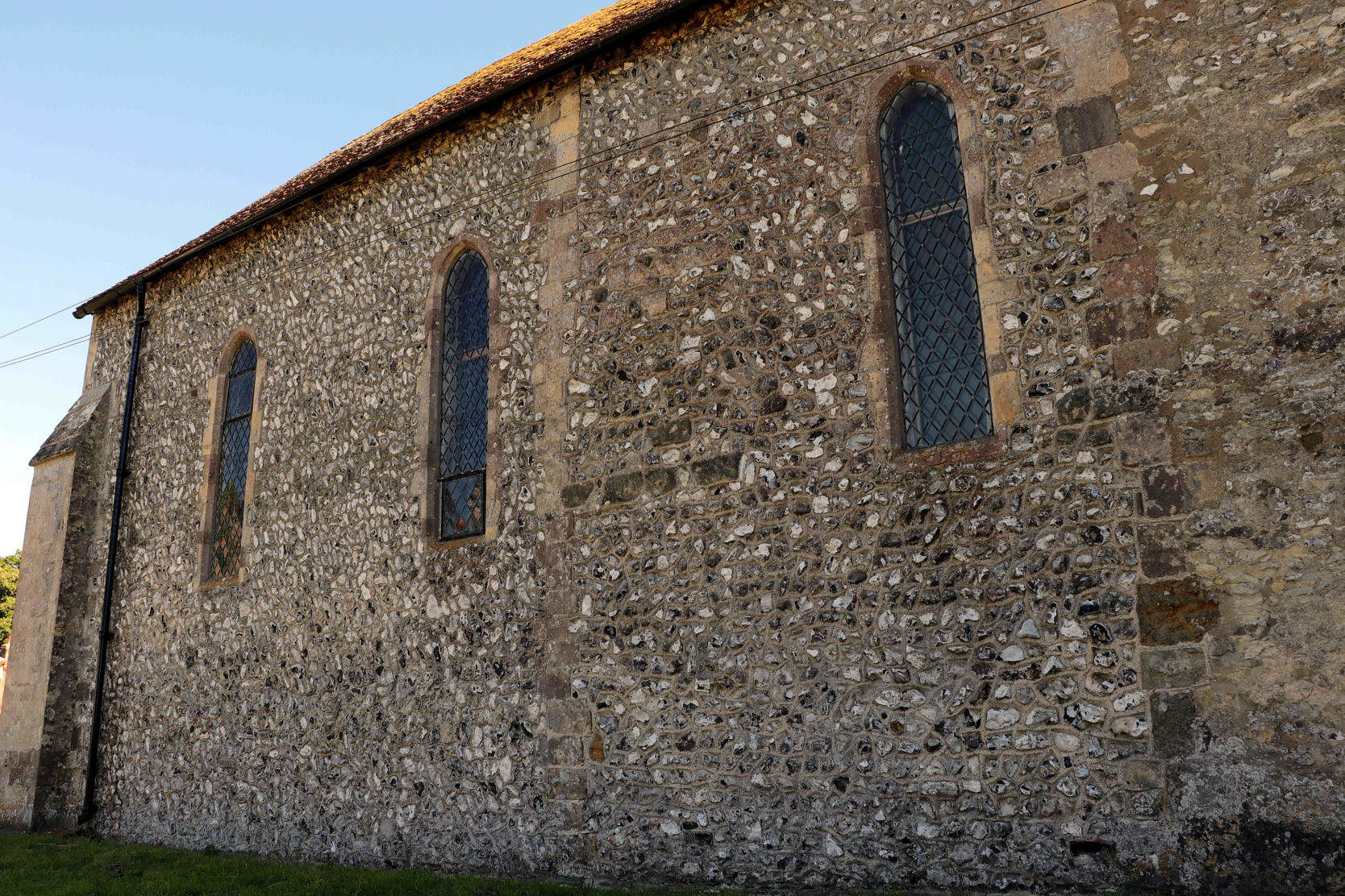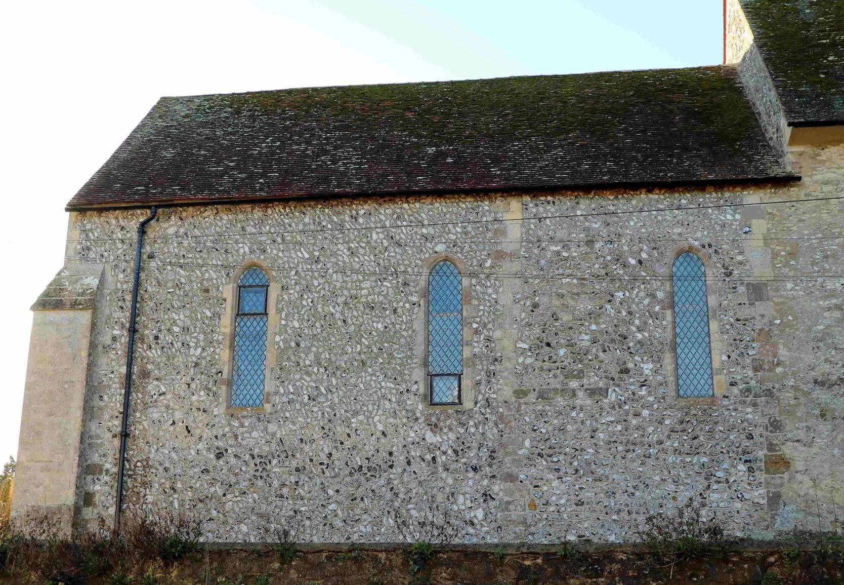 The east (left in the photographs) part of the chancel wall is markedly different from the west part. Both parts of the chancel wall, the original and the later extension are almost wholly field flint with some quarry flints. But the flintwork varies very noticeably over this wall. To the west, the older part, the flints are laid essentially randomly, with some pieces of malmstone incorporated. The flints below the lancet tend to be much larger than the higher ones. Maybe not surprising: it would be easier to carry the smaller flints up ladders. To the east, the flints have been laid with much more care. But here again, there are noticeable differences.