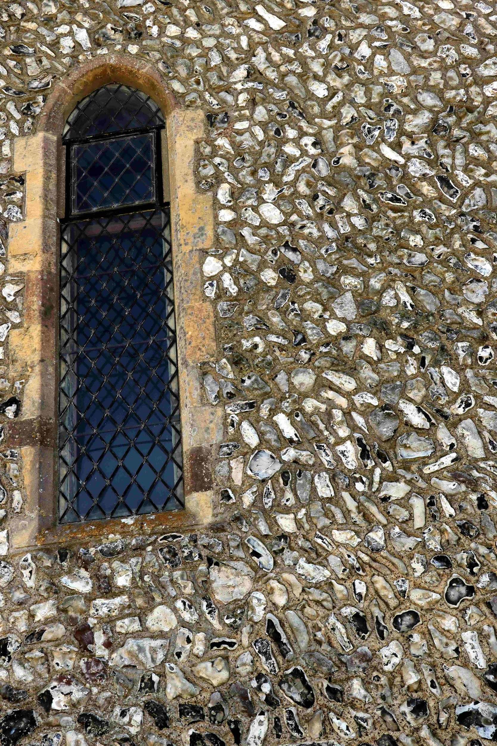 The flints to the bottom right of the middle lancet are mainly long and thin and laid on a slant, while those below the lancet are much chunkier. To the left of the chancel wall and to the top, the flints tend to be smaller, and seem to be laid more in courses than elsewhere on the wall. So, what might we conclude from this?