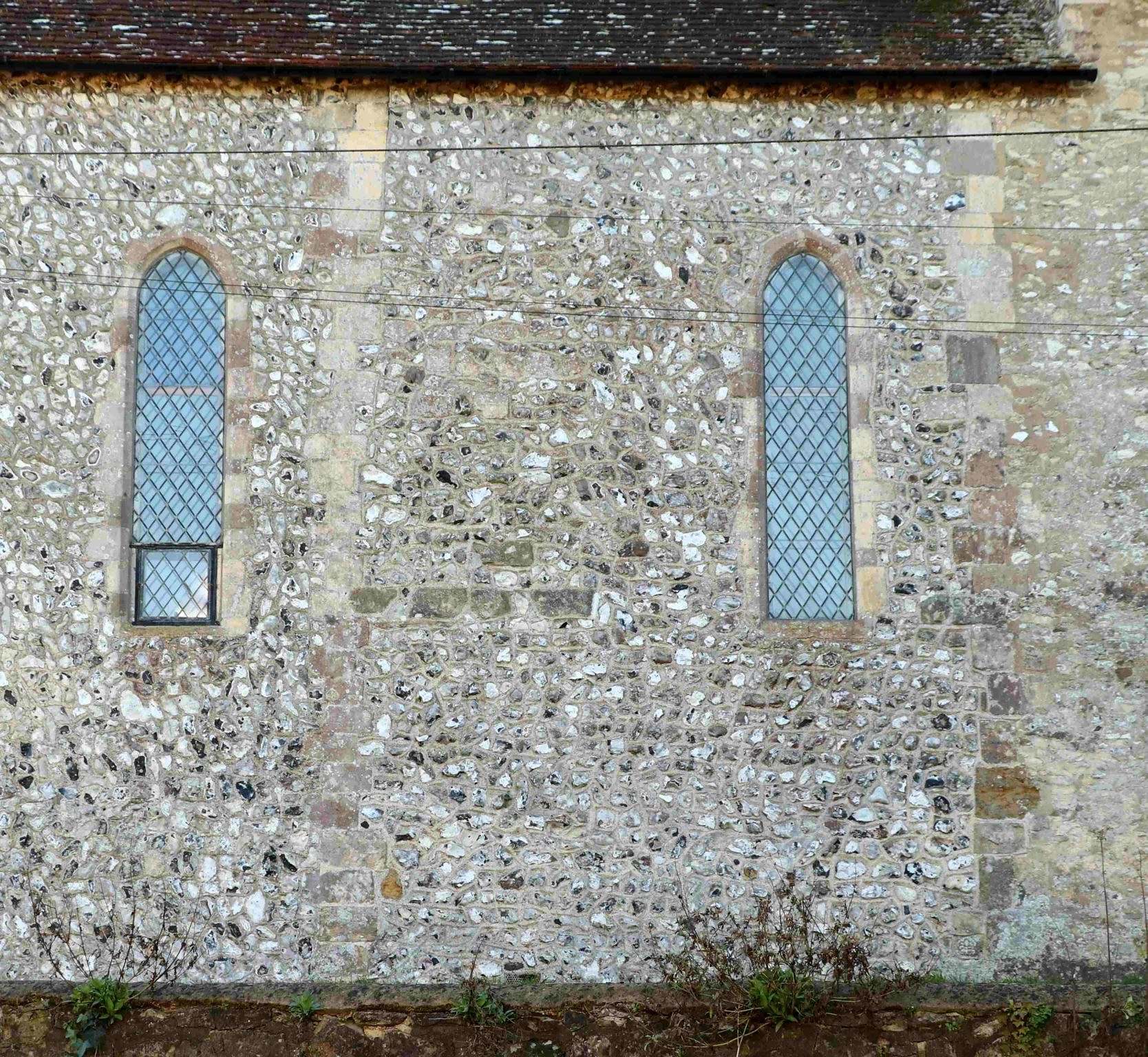 There are odd bits of masonry inserted more or less randomly, indicating repairs or simply that the workmen were using whatever materials were at hand at the time. Occasional pieces of reddish sandstone are actually Pulborough Stone which has been burnt – whether due to a fire at the church or elsewhere, we can’t be sure, but there are so few pieces that it would seem more likely that these came from another location, most likely quite local, where there had been a fire.