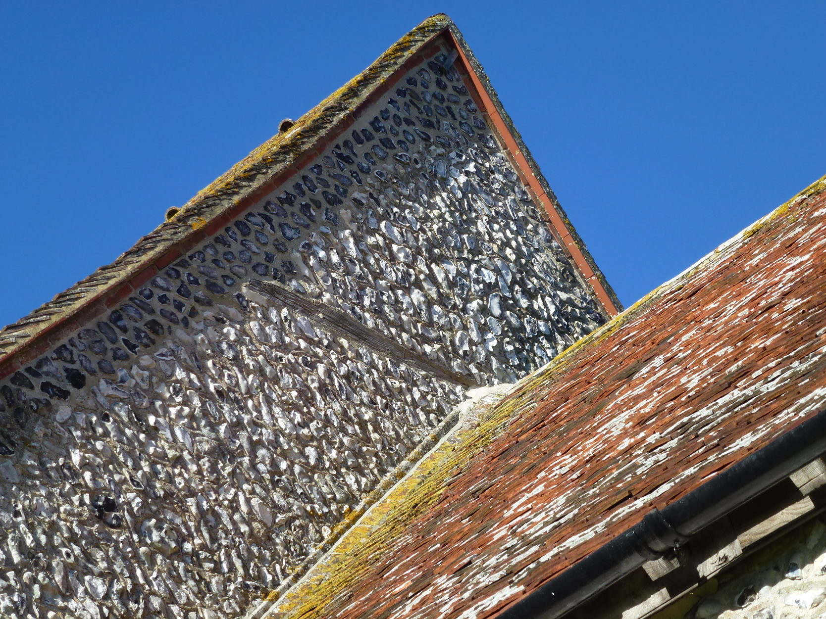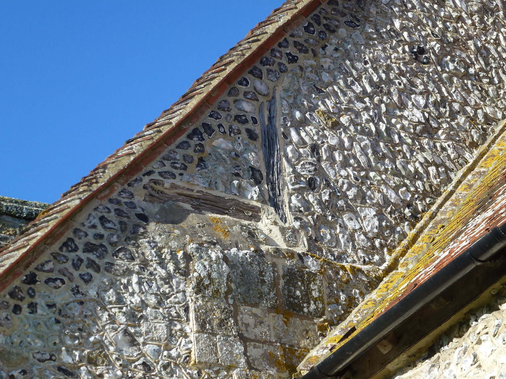 The amount of flint replacement is greater than might be expected for minor repairs. In fact the east gable of the nave wall was weatherboarded prior to 1864, when the present flintwork was substituted.