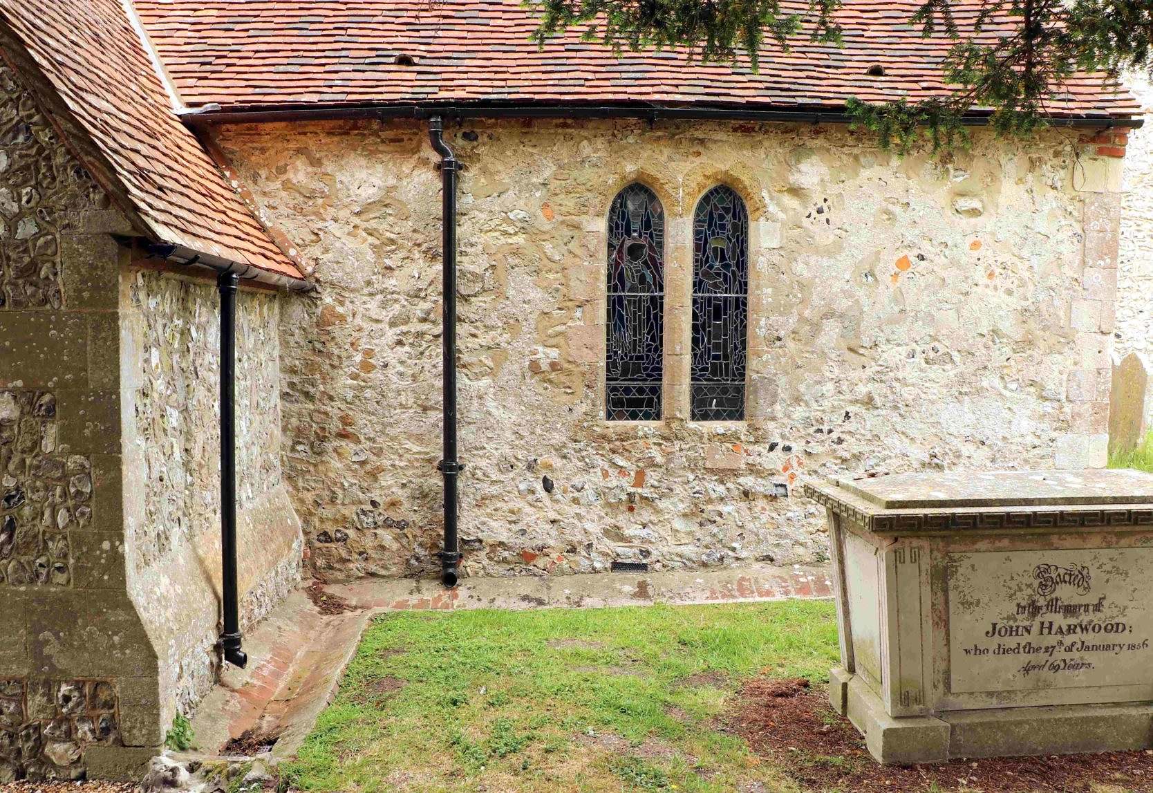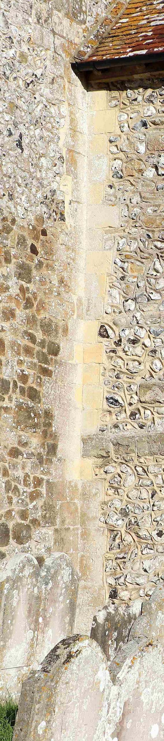 In contrast to the almost wholly flint south chancel walls, the south aisle extension is rubble built below, up to about the top of the lancet, with most of the remainder random flints towards the roof, as if there had been major repairs to the upper part of this wall at some time. The stones to the left of the lancet look different, lighter in colour than those on the right. Those on the left are local Amberley malmstone, the ones on the right are mainly Pulborough Stone.