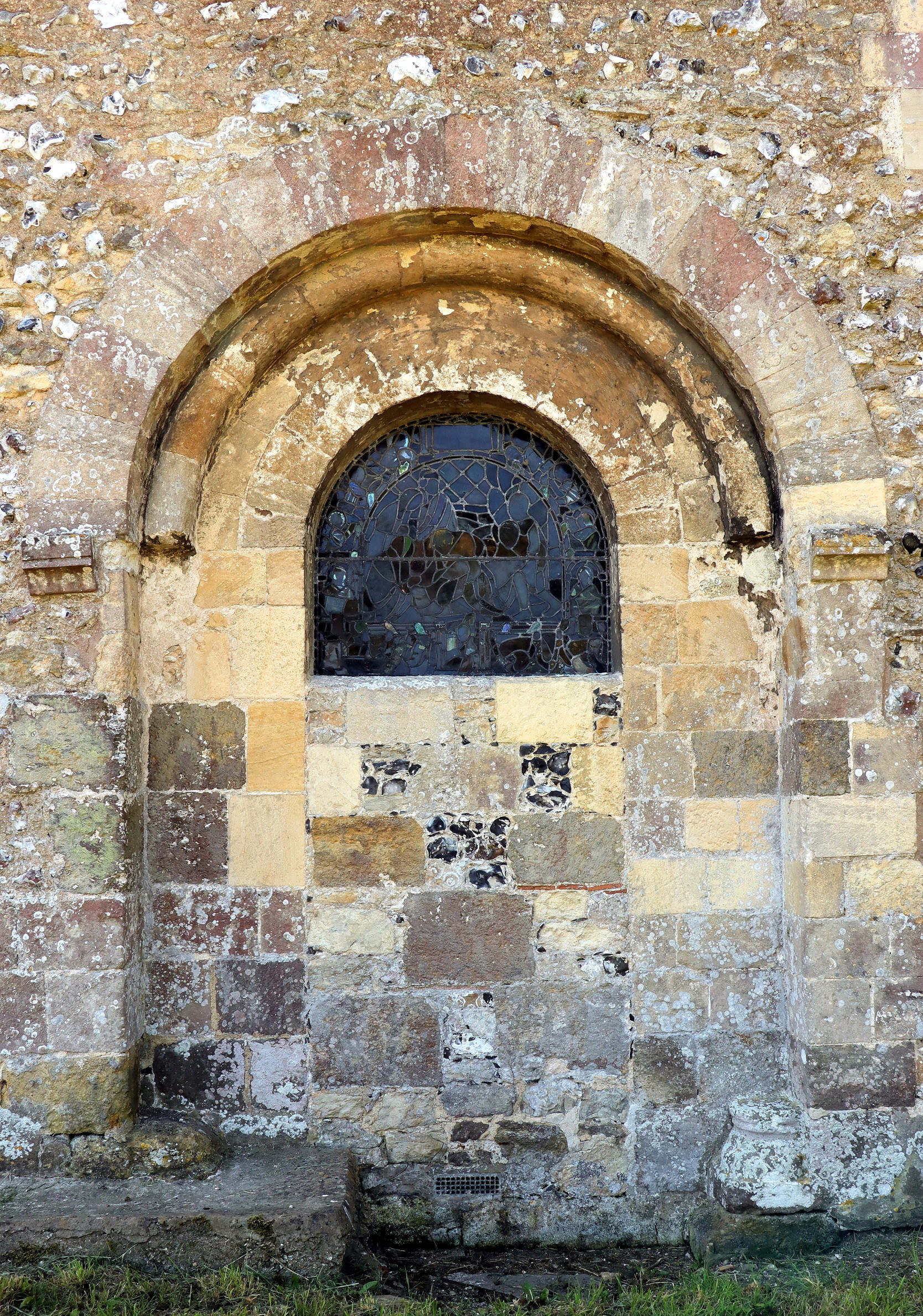 The door infill looks like someone decided to try to make it look pretty, with different coloured stone blocks (Caen stone, Pulborough Stone, flint), and even a few pieces of tile. But it does look a bit of a mess, as if no one really cared what it looked like. The stained glass window, even viewed from the outside, is clearly relatively new, as we know from inside. The original blocks are also a bit of a mishmash, with only the outer and inner arches using a single material: Caen stone for the inner arch; Pulborough stone for the outer one.