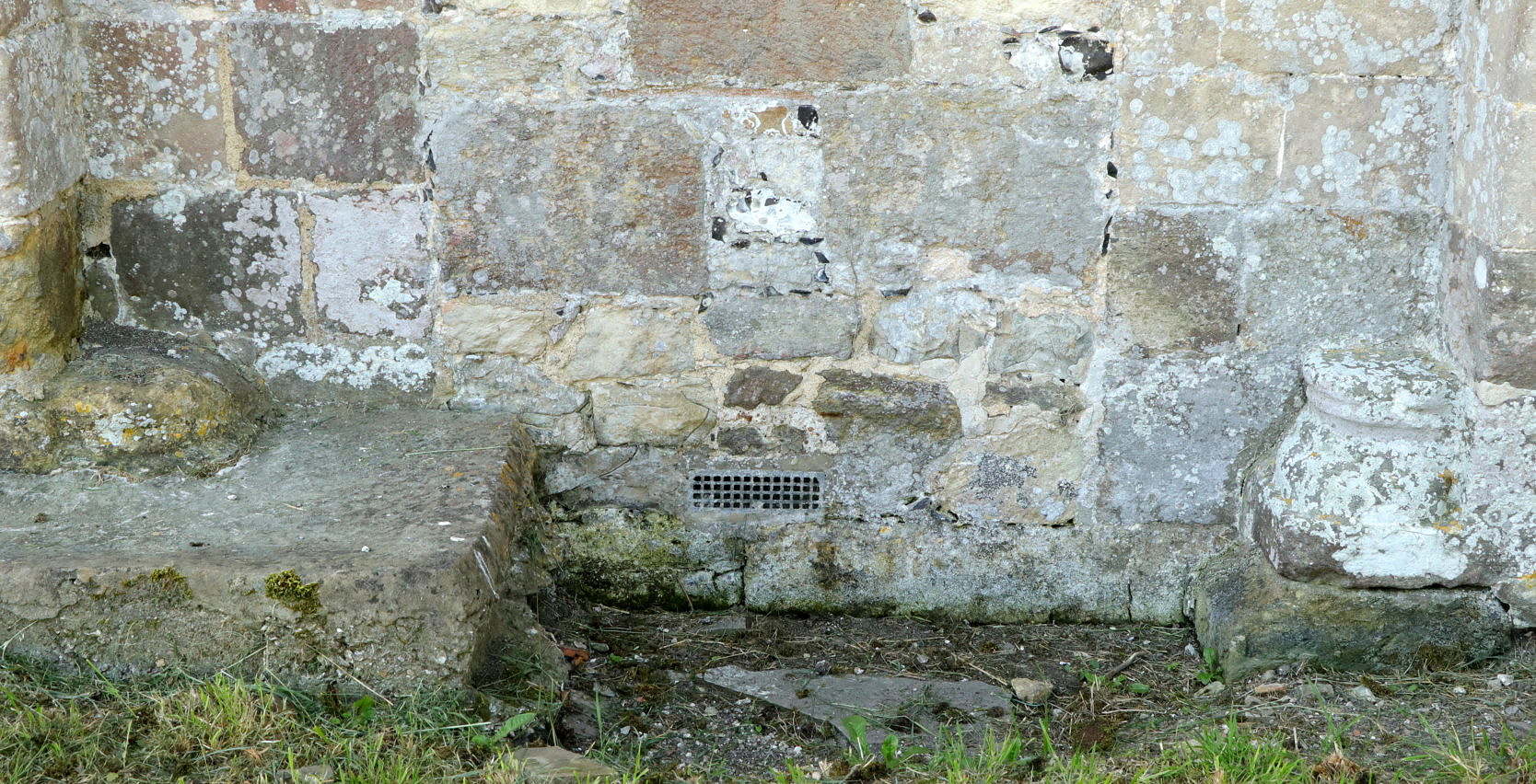 The old doorway has been hacked about a bit. There clearly were nook shafts at the sides, separated by the roll-moulding between the arches, but only their bases remain. Why these shafts were removed is a mystery. The blocked entranceway itself is noticeably narrow for its height: barely 4 ft (112 cm) wide but 9 ½ ft (290 cm) high — more Saxon than Norman in scale, though the style is otherwise Norman. But there was never a sharp cut-off between Saxon and Norman, Norman and Early English, or between any consecutive architectural periods. In the early Norman period one would expect still to see signs of the preceding, Saxon, period. And in fact, to the right of this doorway, adjacent the western buttress, near the ground, the masonry is set in Saxon mortar. Whether this is a relic of the previous Saxon church or a continuation into Norman times of Saxon building practices may never be known.