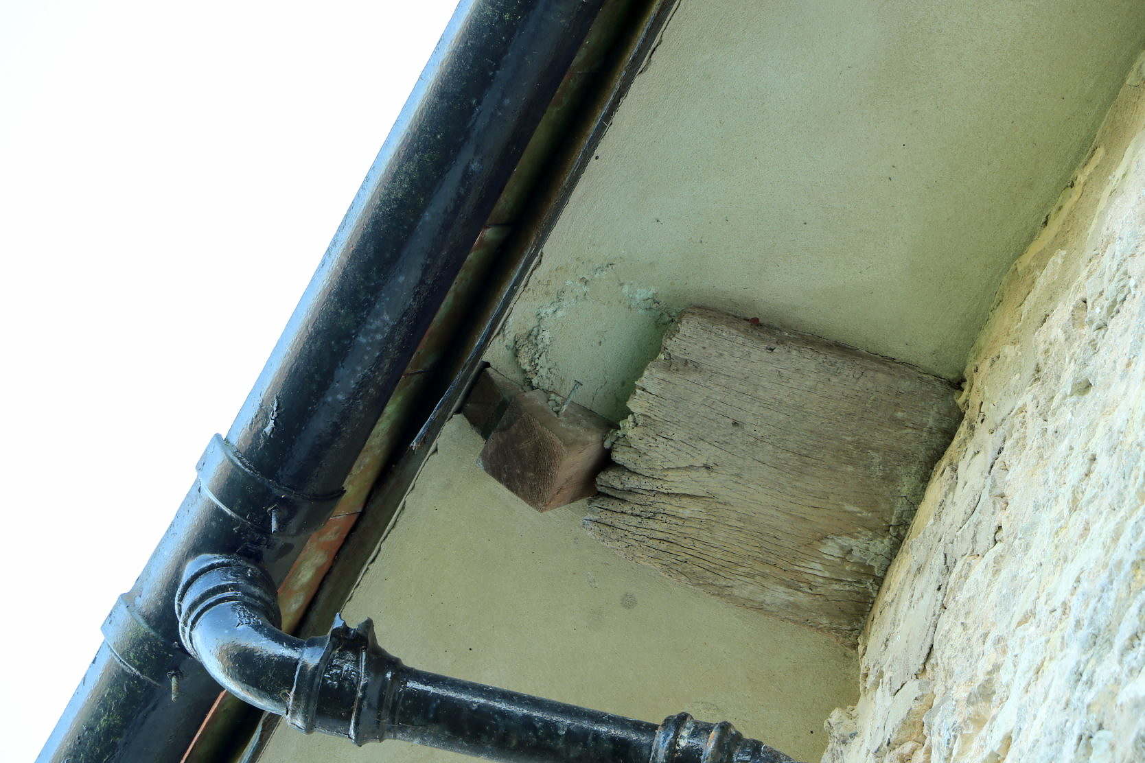 Recall that inside the church, in the nave and the south aisle, the rafters have triangular supports at their ends, with the horizontal part resting on the nave walls. By allowing these horizontal timbers to project beyond the outer wall, creating this wide eaves overhang for the soffit, the roof could be raised without the need — and the expense — of heightening the north wall as much as would otherwise have been needed.