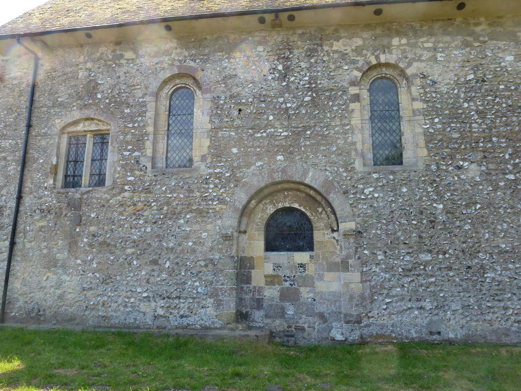Let’s consider the older part of the church, the nave wall, with its two Anglo-Norman window, and what looks like the original doorway, though now blocked up.