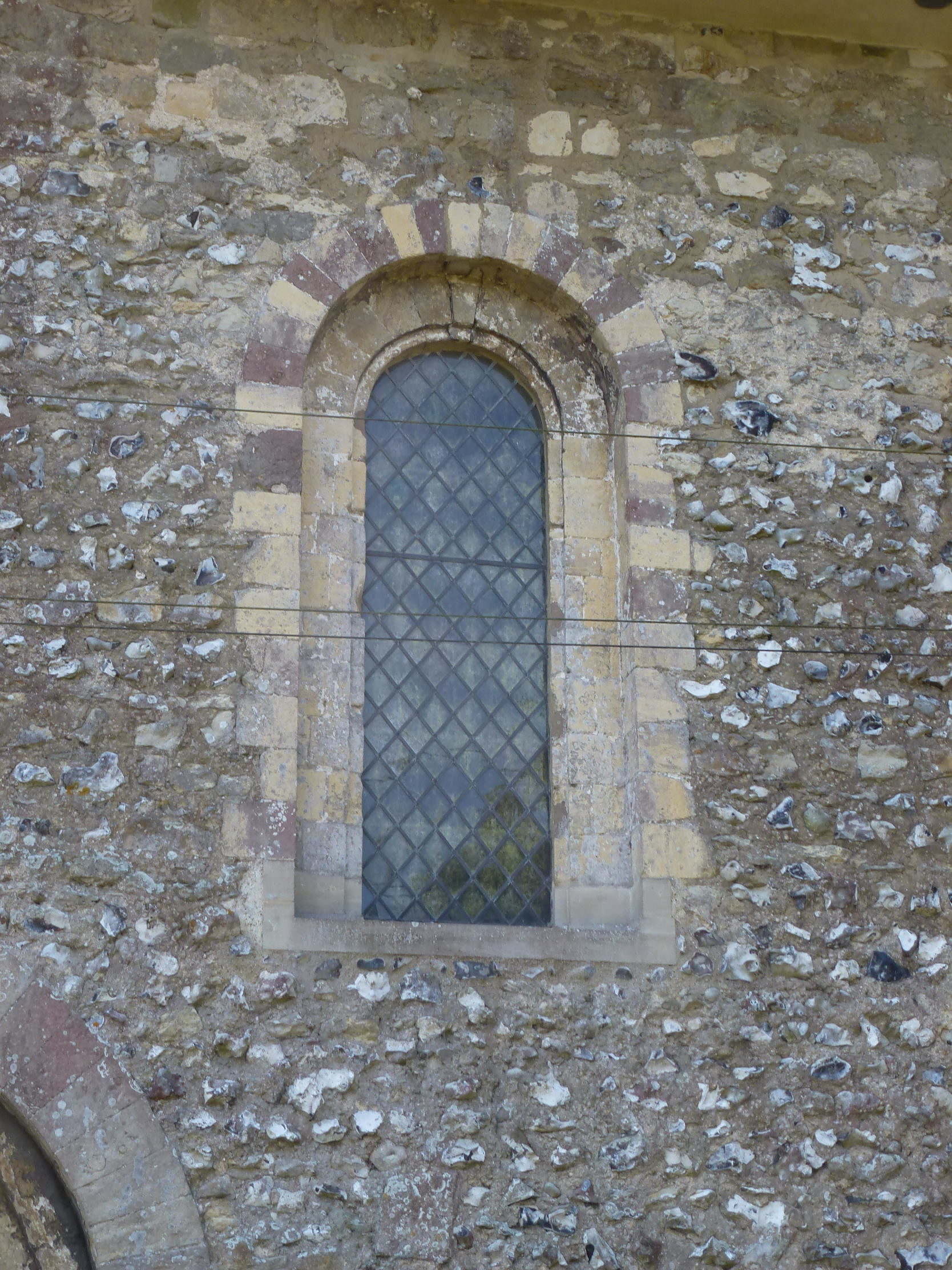 Of the two Norman windows, the one on the right looks as if the mason started to construct the outer head arch of alternating colours, like a Moorish arch, using Caen stone and the darker Pulborough stone. But this alternation was not completed.
