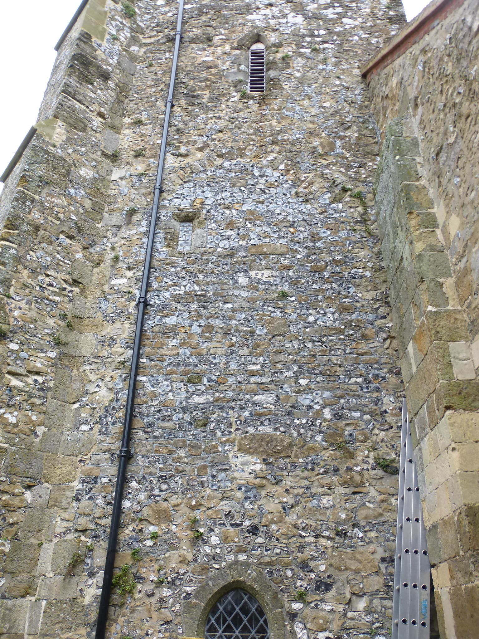 The tower construction uses a mix of rubble – largely local, Amberley Blue, malmstone, with substantial areas of flint. There are distinct differences in construction from the bottom to the top, with the top quarter largely rubble.