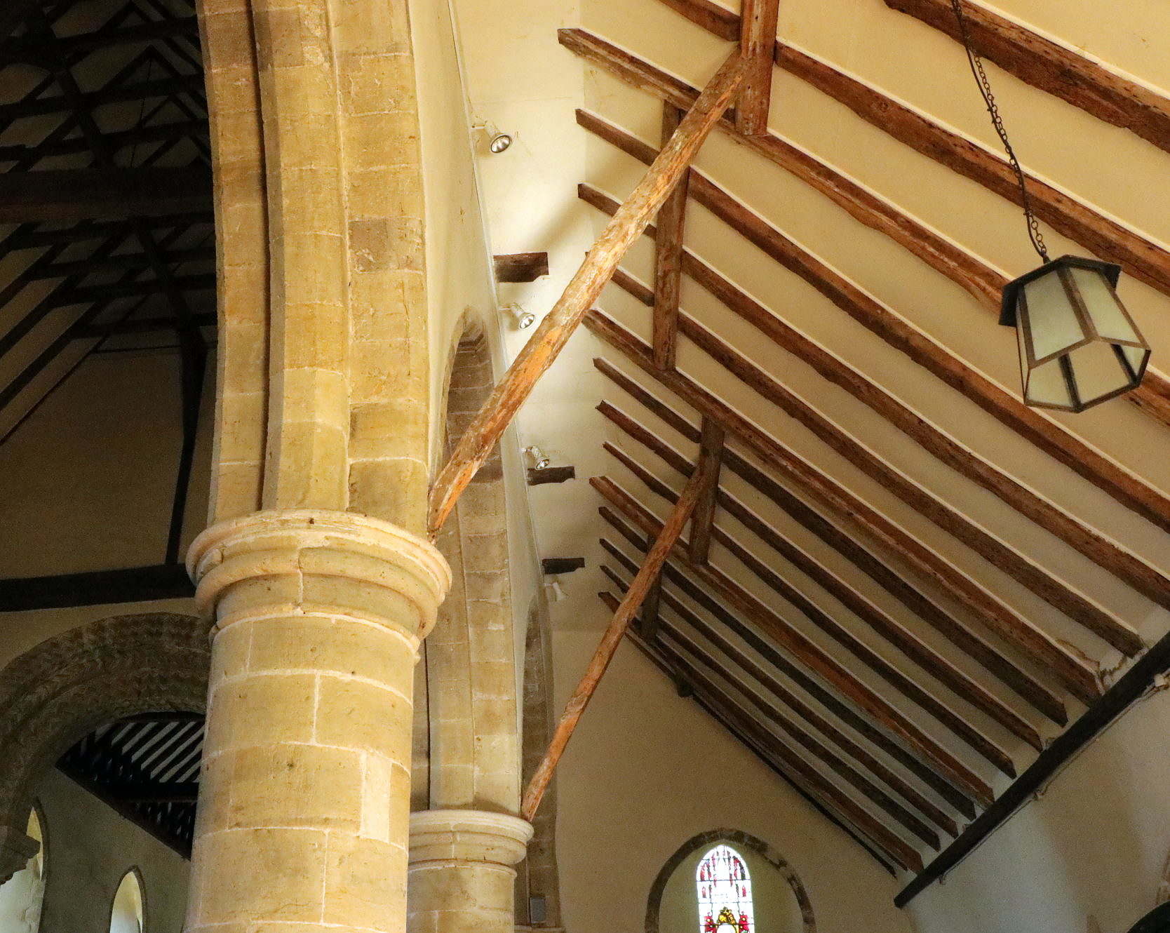 Unusually, the ends of the supporting struts rest on the capitals of the arcade pillars. This looks like a ‘belt and braces’ appproach to providing support to the rafters.