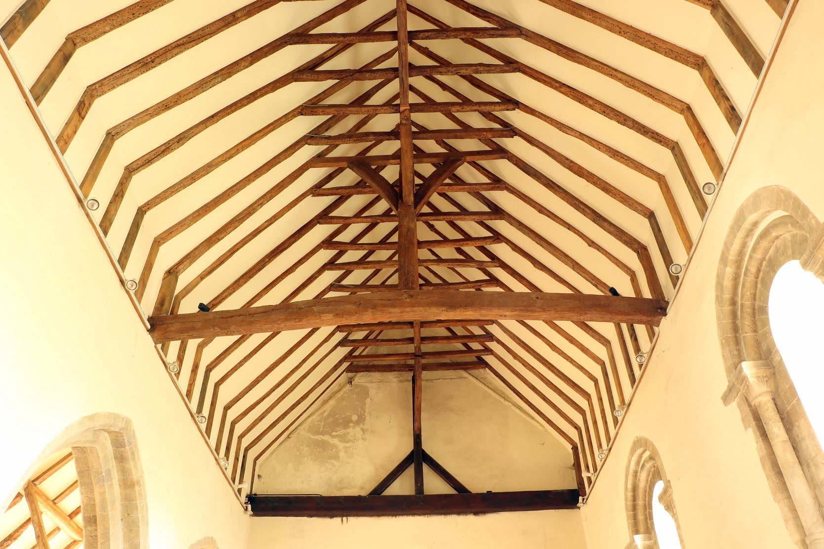 The nave timbers are consistent with late 14th century work. The unusually long ashlar pieces – about twice the normal length – relate to the raising of the roof when the aisle was constructed.