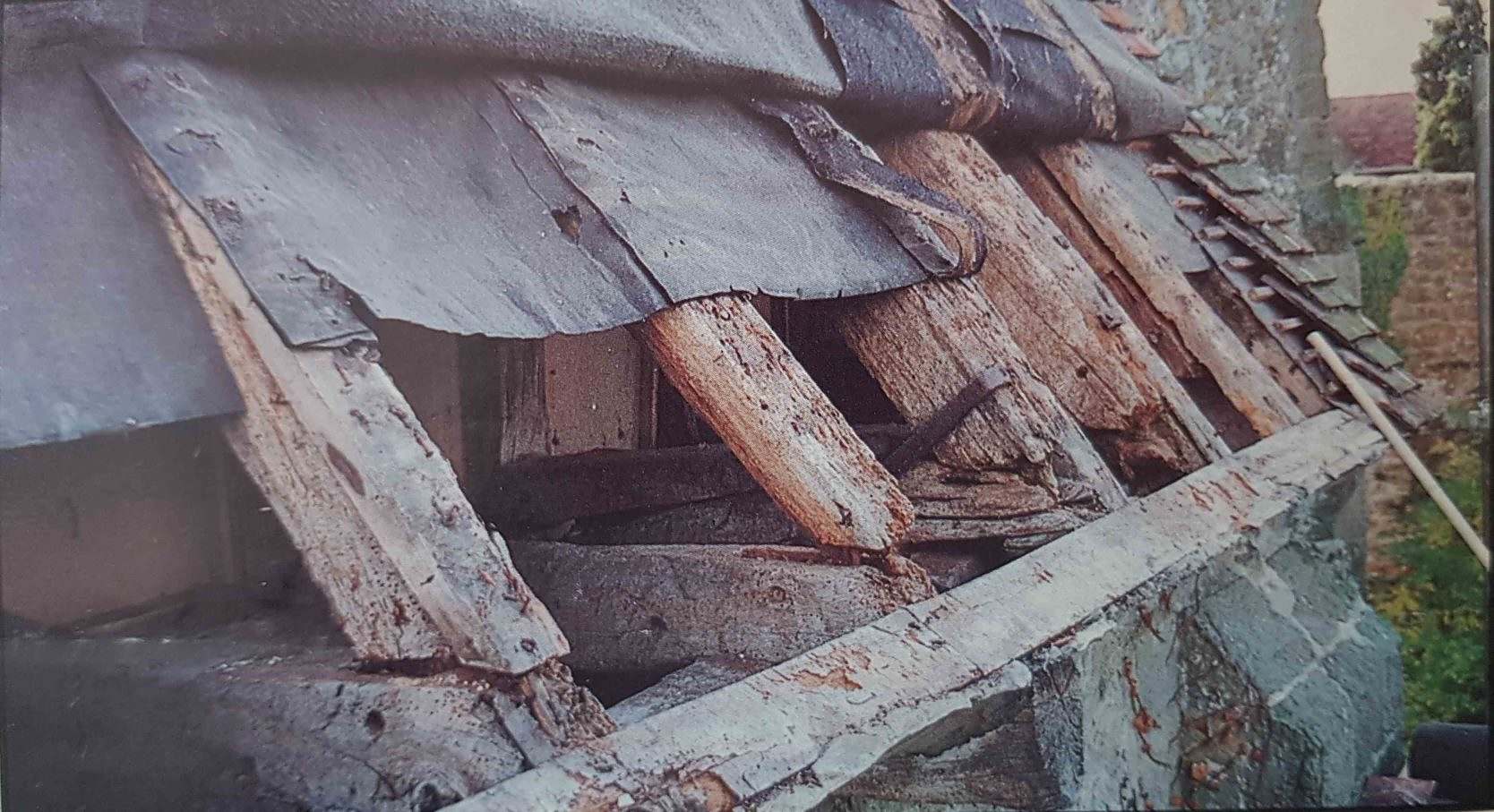 The photo below shows the rafter and sole pieces above the south wall of the nave. The door to the eaves void can just be glimpsed in the middle of the photo. The timbers had been much damaged by rot and by death watch beetle, necessitating major repairs in 1995.