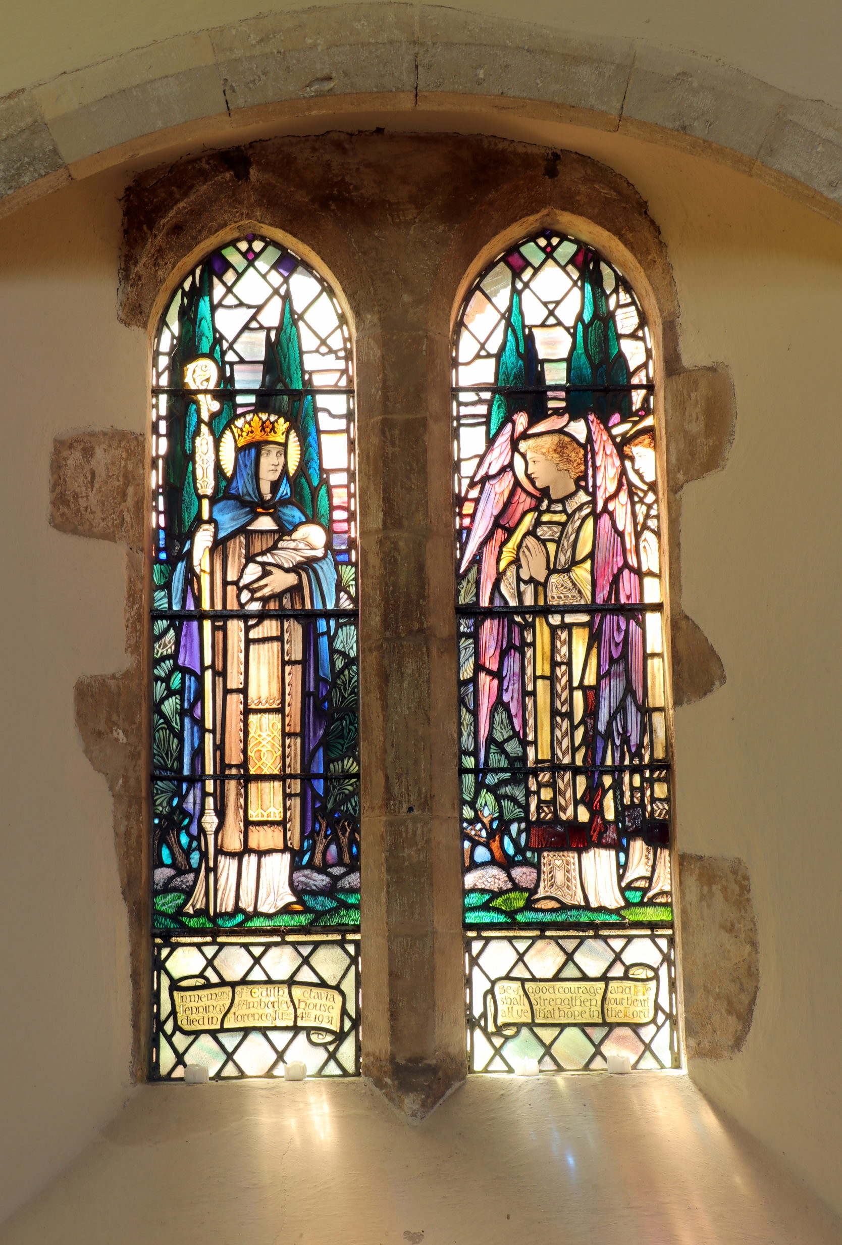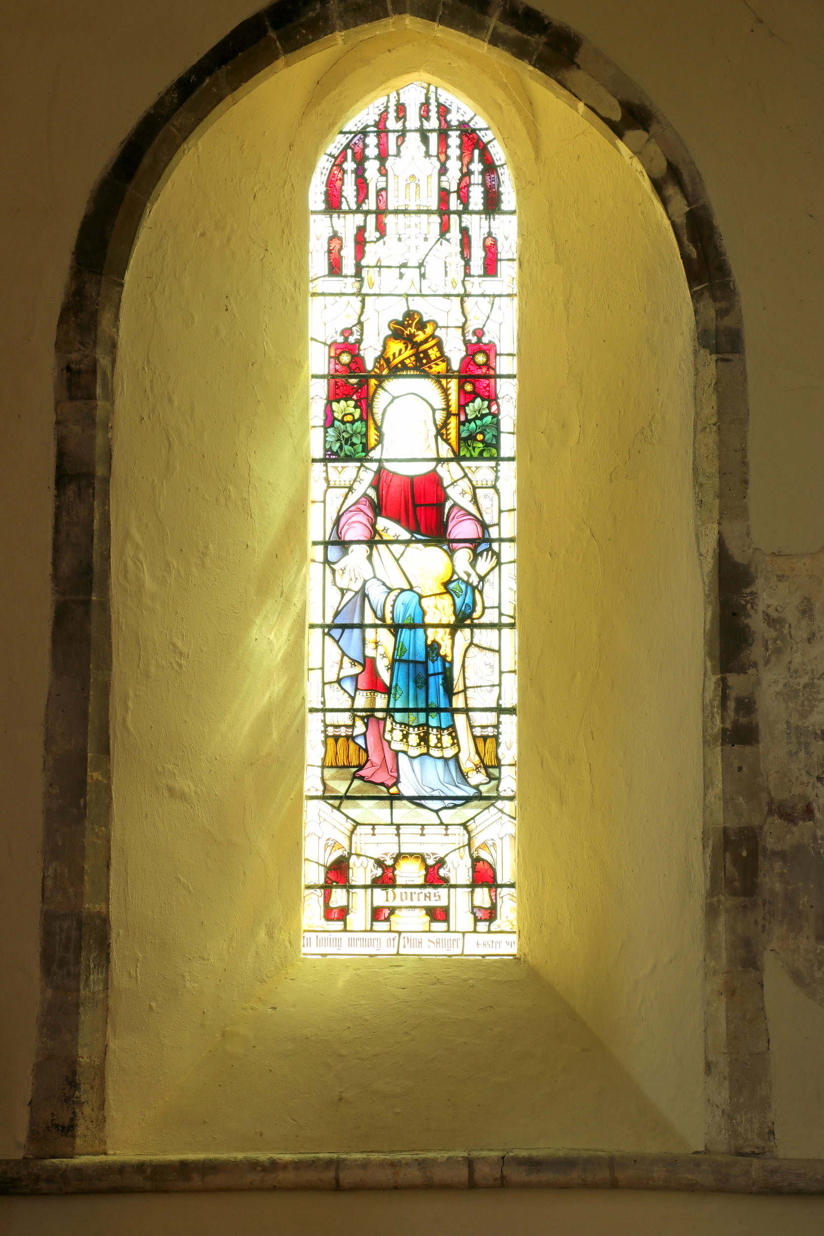 The stained glass in the east window of the aisle is a memorial of 1915 to Nina Sanger. Although she didn’t live in Amberley she was generous to the parish and is buried in the churchyard. It represents Dorcas and a young child. See Stained Glass for more details of the glass.