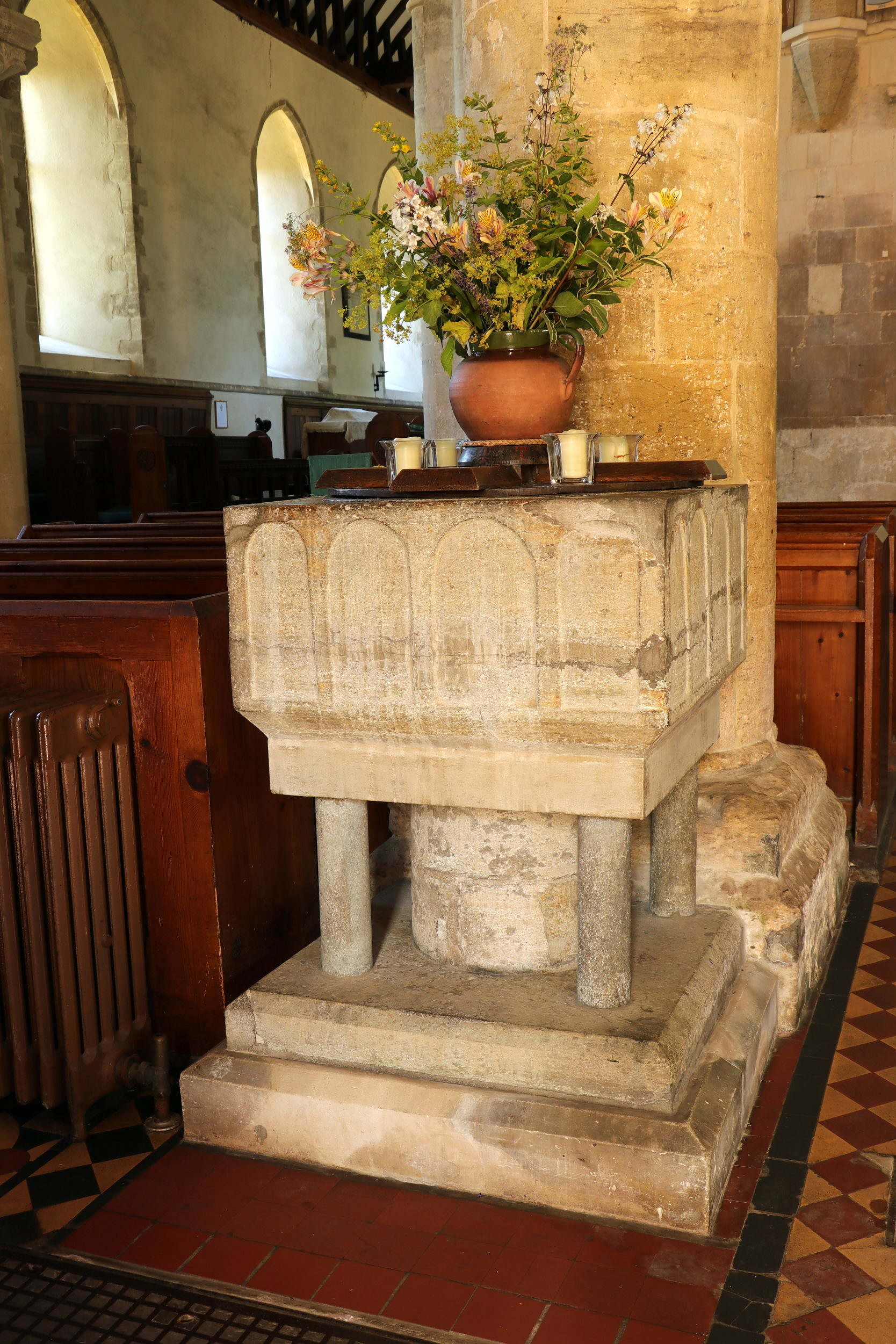 The font is a quite typical, square, 12th century Sussex font, of Purbeck marble, with four relatively crude incised blind arches on each side. Visible cracks indicate that the font was broken at one time (possibly by Puritans in the mid-17th century who objected to fonts and threw them out of churches). It was moved in 1864 from its original position on the west side of the west pillar of the arcade, where it was much closer to the west door. When moved, it broke into twelve pieces and was repaired, the present stone slabs underneath the bowl and at the base were introduced, and previous wooden corner pillars replaced by ones of Purbeck marble. So only the square bowl and the central pillar are original.