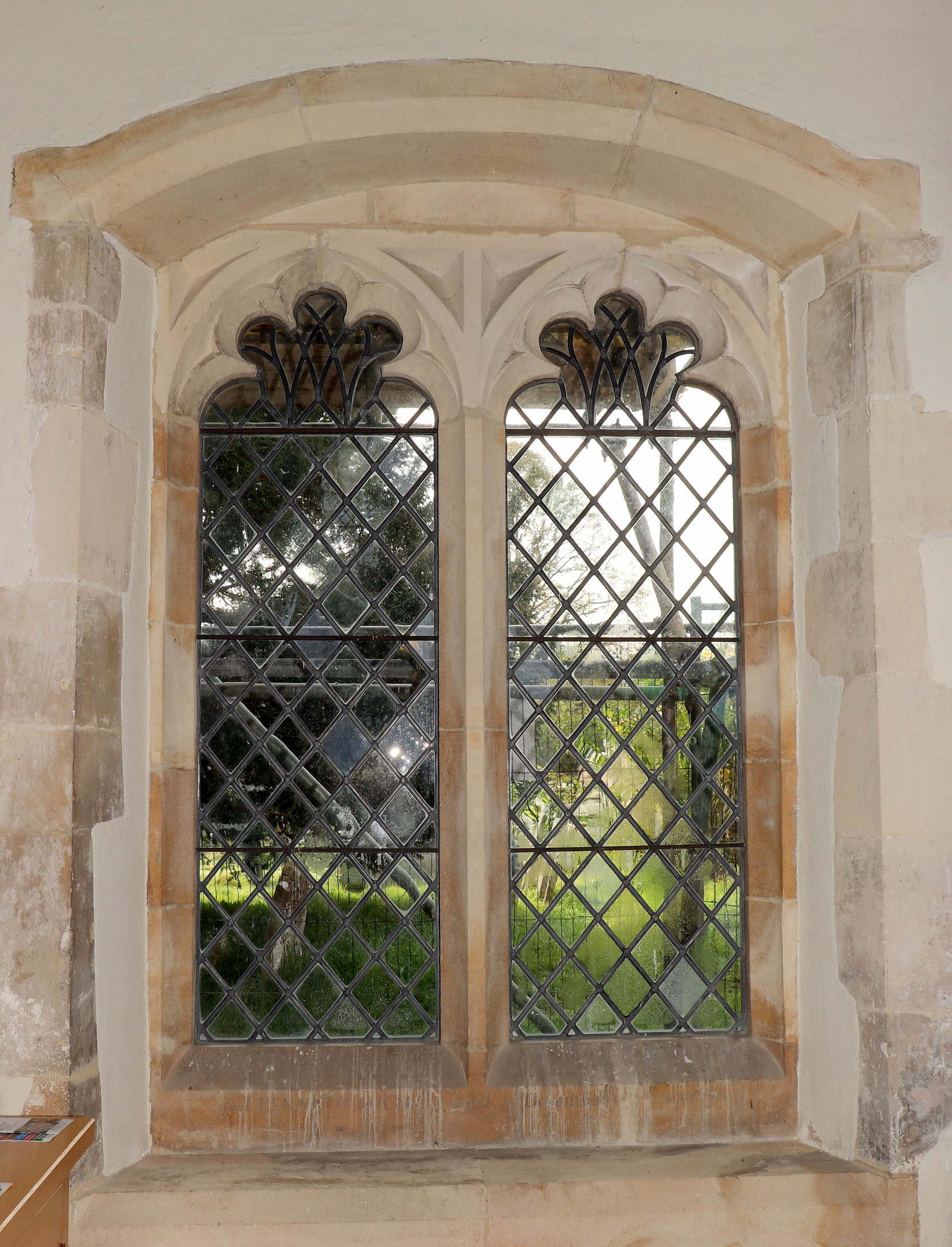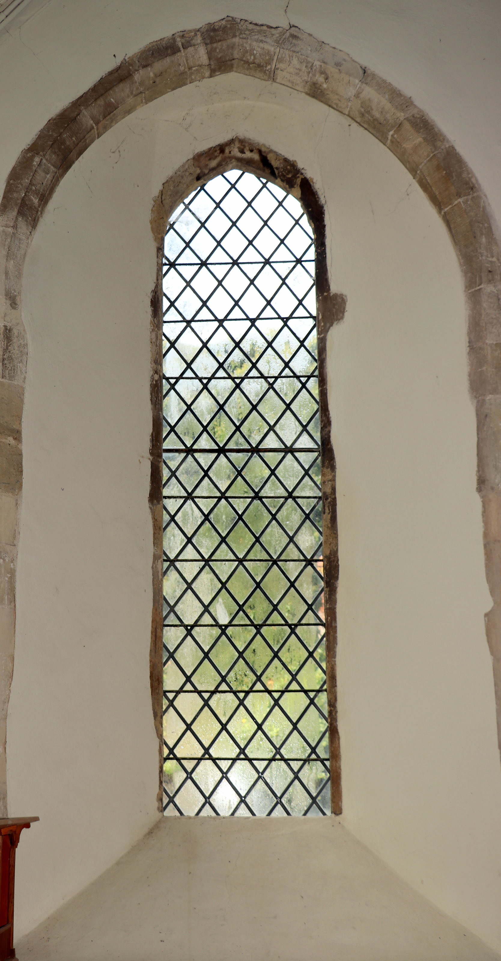 From the shape of the window opening the double-window may have replaced an earlier single window, but possibly long before the 20th century stained glass was inserted. As can be seen outside, the stone voussoirs of the two lancets are very worn. This is unexpected, and seems to indicate the use of a poorer quality stone than the jambs.