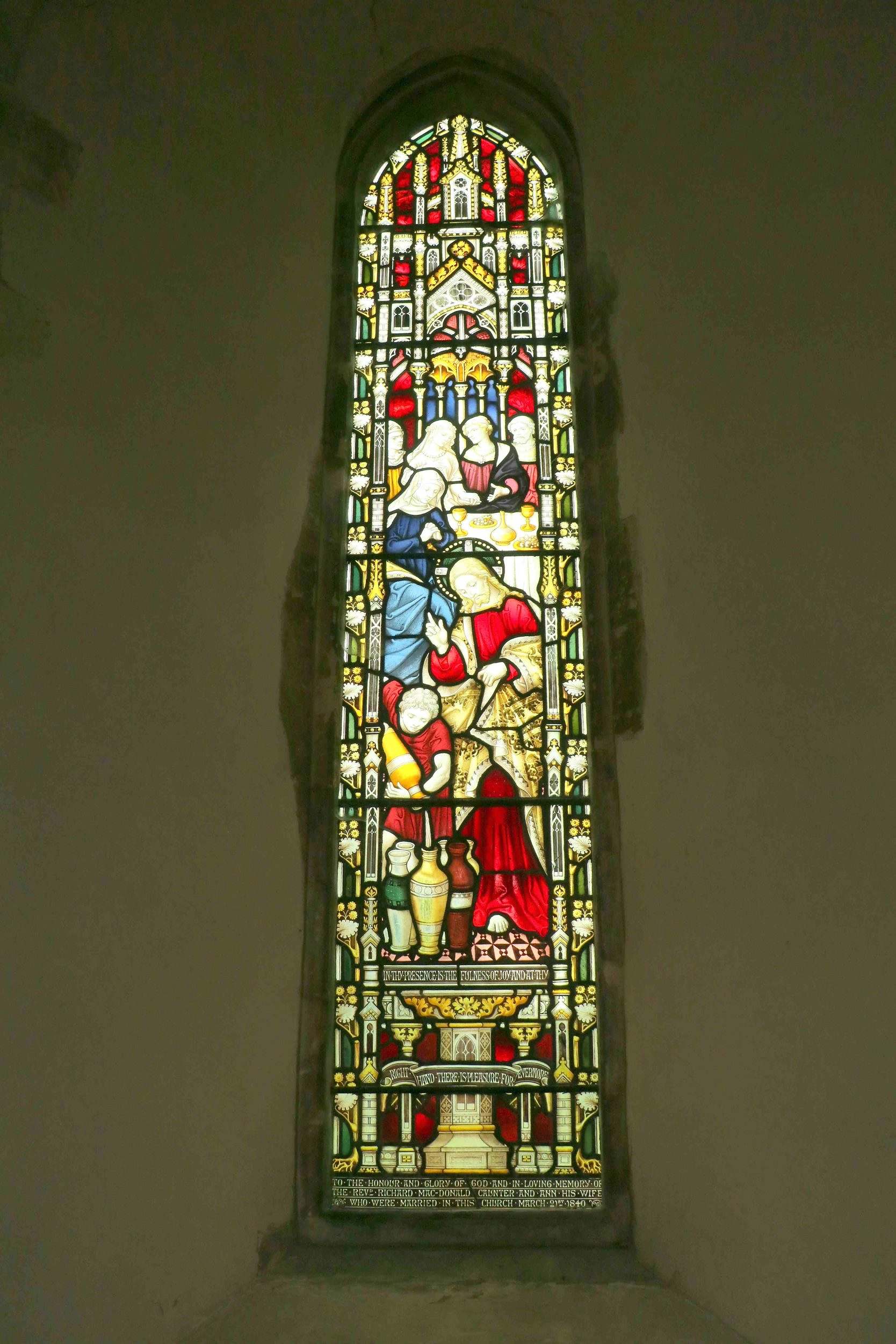 This window represents the Marriage at Cana, when Christ transformed water into wine, the first miracle attributed to Jesus in the Gospel of John.