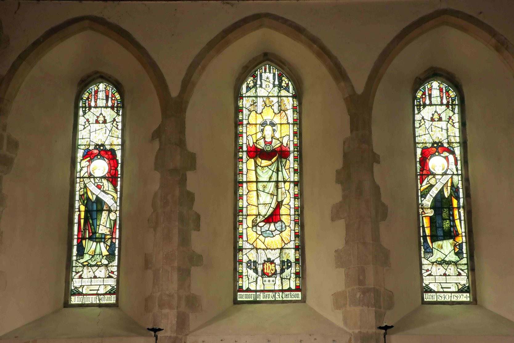 The windows portray Christ’s Ascension, and are by Edward Jenkin Prest.