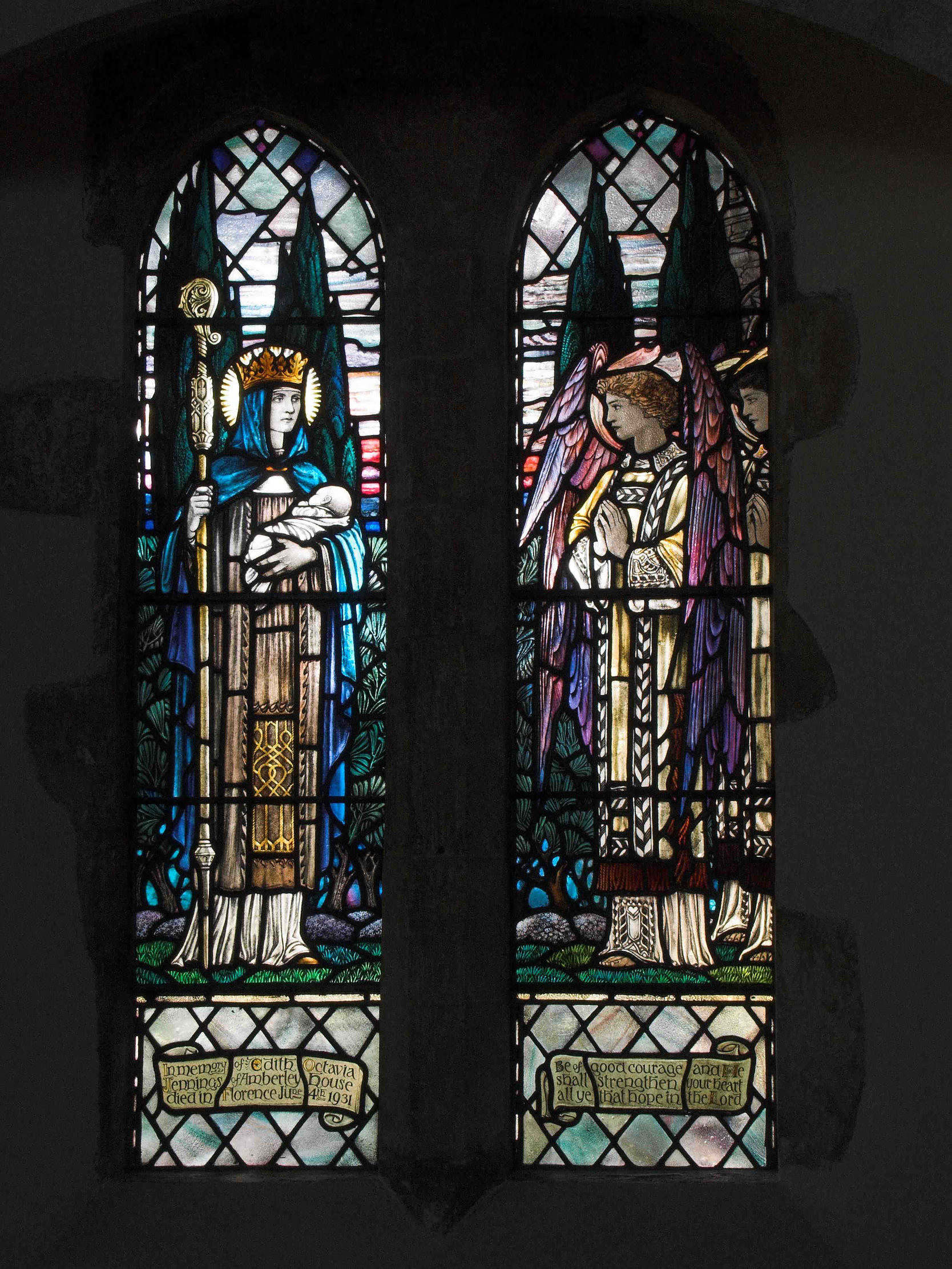 The two-light window in the south wall of the aisle, of 1933, is by Veronica Whall. It portrays St Edith and child on the left, and an angel on the right. The memorial is to Edith Octavia Jennings, of Amberley House (almost opposite the church), who died in Florence in 1931. The text at the foot of the right-hand window is from Psalm 31: 24: “Be of good courage and He shall strengthen your heart all ye that hope in the Lord.“