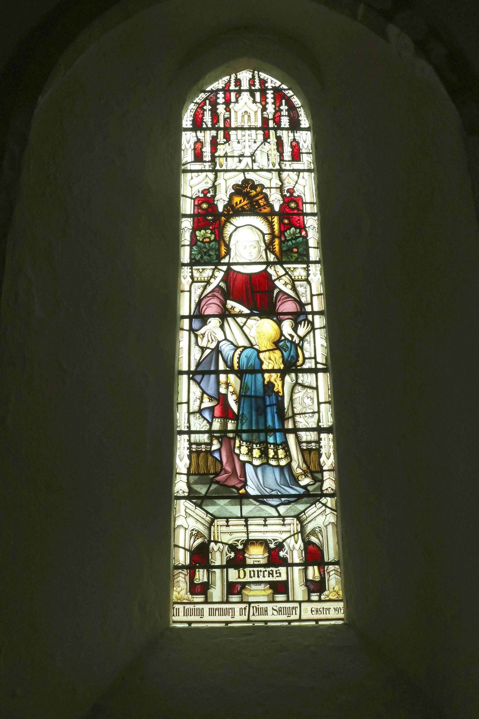 The window represents Dorcas and a young child. Dorcas, or Tabitha, is mentioned in the Bible in The Acts of the Apostles (Acts 9:36-42) as a disciple from Joppa. She “was full of good works, and alms deeds which she did”, including making coats and garments for the poor. She fell sick and died, but St Peter was sent for, and raised her from the dead. As a result of this miracle “many believed on the Lord”.
